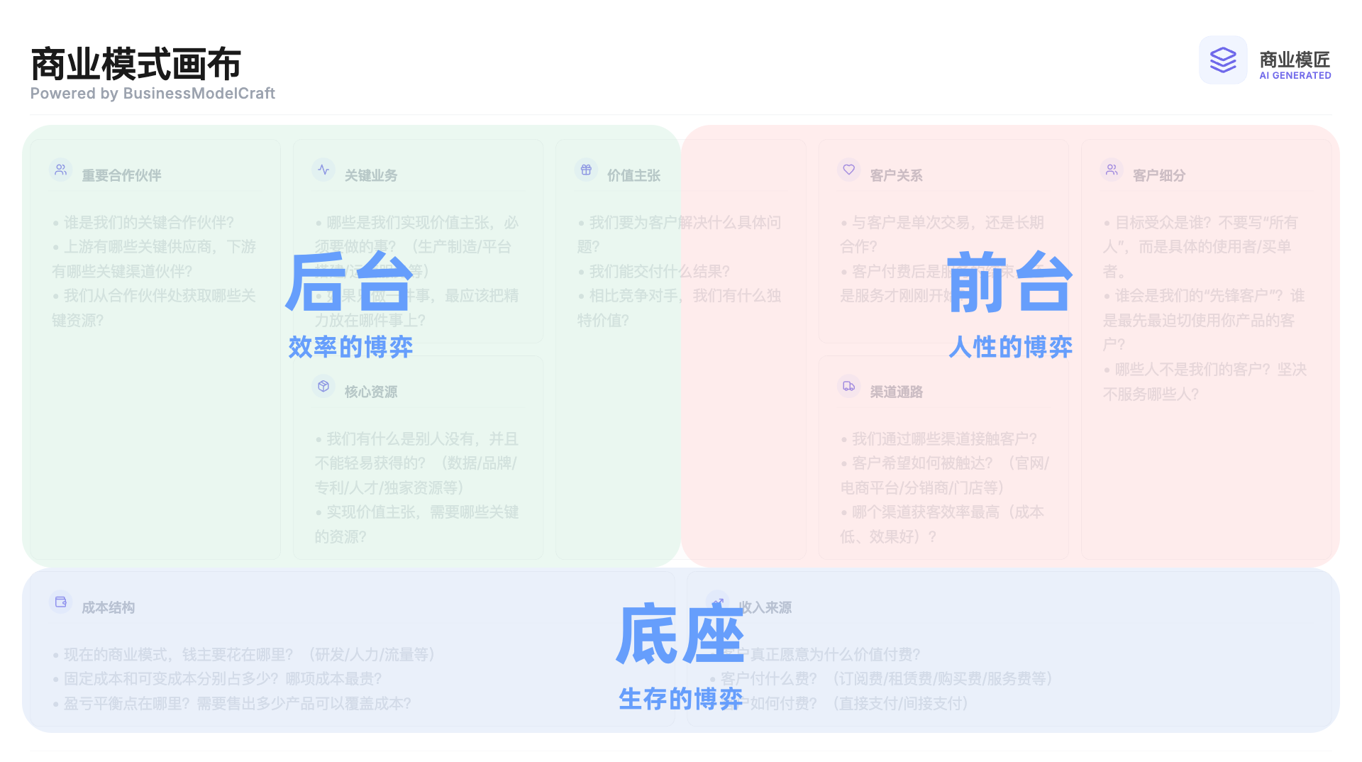 在过去我书写商业模式画布的时候,想要找一个清晰好用的画布工具,一直没找到。终于在2026年初,我借助AI编程,自己开发了一个商业模式画布的画板 BusinessModelCraft.com。